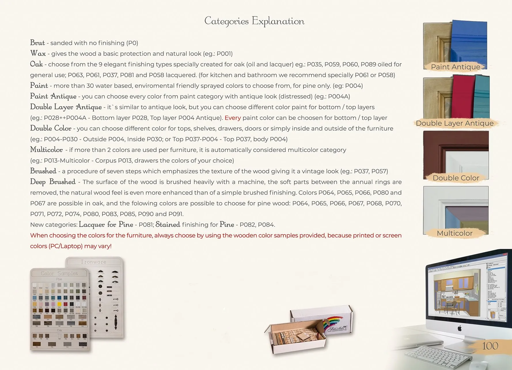 Gore prikazane kategorije boja izrađene su samo za puno borovo drvo. Razlog tome je što drvo bora može apsorbirati boju, dok je puno hrastovo drvo preteško da apsorbira boju zbog čega se za hrastovo drvo može koristiti samo način ili lazura.